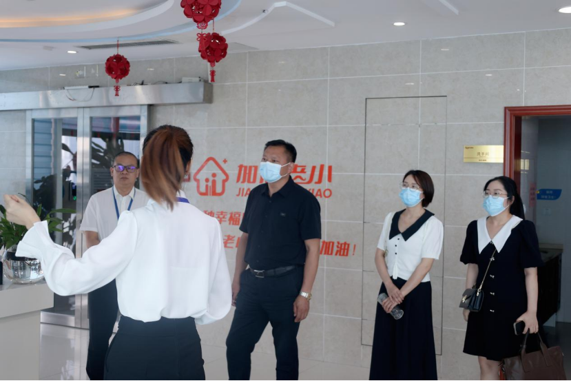 考察组详细了解河南讯丰信息技术有限公司“加油老小”一站式家庭护理服务平台,并与郑州师范学院社会服务与发展学院院长王工厂教授在家庭照护、老年人照护、母婴护理等家政行业、托育行业的学科建设、人才培养、实验室建设、技能大赛等进行了深入交流。