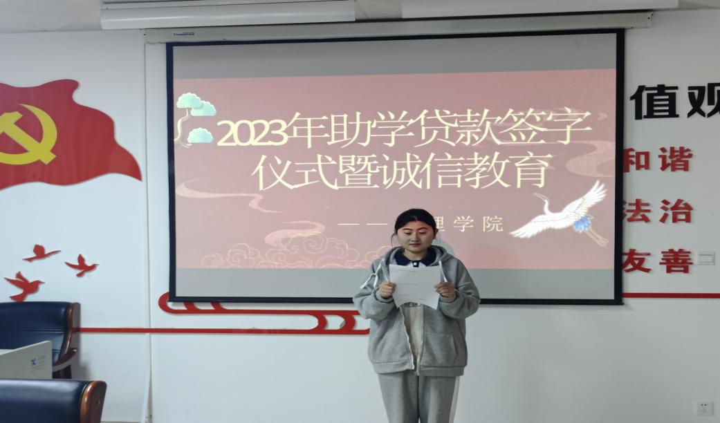 后,本年度校园地贷款学生代表王金莹发言。她首先感谢党和国家以及学校对贷款学生的照顾,在人生旅途最困难的时候雪中送炭,让家庭经济困难学子无后顾之忧,并且承诺会在今后的生活中勤俭节约,积极面对生活中的艰难困苦,诚实守信,按时还款,努力学习识,用自己的行动回报母校、国家和社会。
