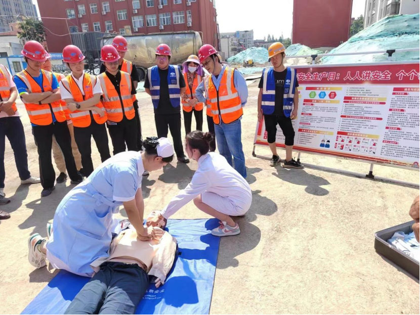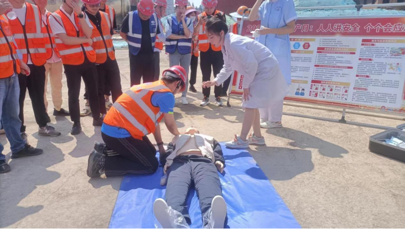 此次“安全生产月”活动主题为“人人讲安全、个个会应急”。触电应急演练中模拟了工人在施工现场意外触电的情形,并按照触电事故应急预案进行了紧急现场处置。整个演练过程,环环相扣,参加演练的人员行动迅速、操作高效,达到了预期演练效果。演练结束后,王璐老师向参加演练人员详细讲解触电急救、心肺复苏、人工呼吸、胸外按压等急救理论知识,系统介绍了发生紧急情况时的应对步骤,确保一旦发生触电事故,能迅速、有效地开展救援。通过理论与实践相结合的方式,让参加人员一一进行模拟操作。